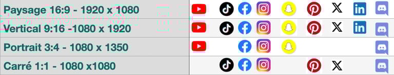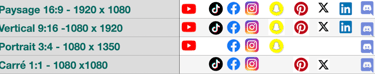 Types de formats, leur résolutions en pixels et les médias sociaux correspondants