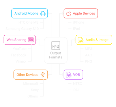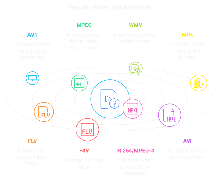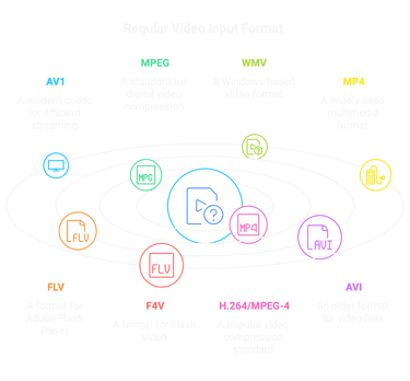 AV1, MPEG, WMV, MP4, FLV, F4V, H.264/MPEG-4, AVI, DivX, XviD, MOV, RM, RMVB, VOB, ASF, 3GP, 3G2, QT, DAT, Google TV, WebM, DV, Vpx 8, G2M4, iCod, YUV411, mp2v, MXF, DAV
