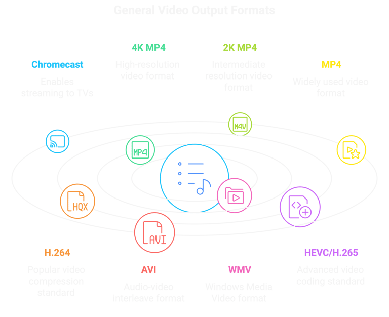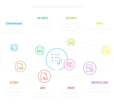 Chromecast, 4K MP4, 2K MP4, MP4, H.264, AVI, WMV, HEVC/H.265, AVC, MOV, M4V, MKV, MPEG1, MPEG2, RM, 3G2, 3GP, ASF, WebM (VP8), FLV, F4V, SWF, DV