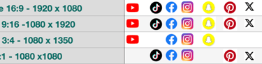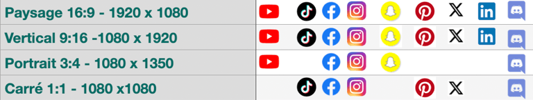 Types de formats, leur résolutions en pixels et les médias sociaux correspondants