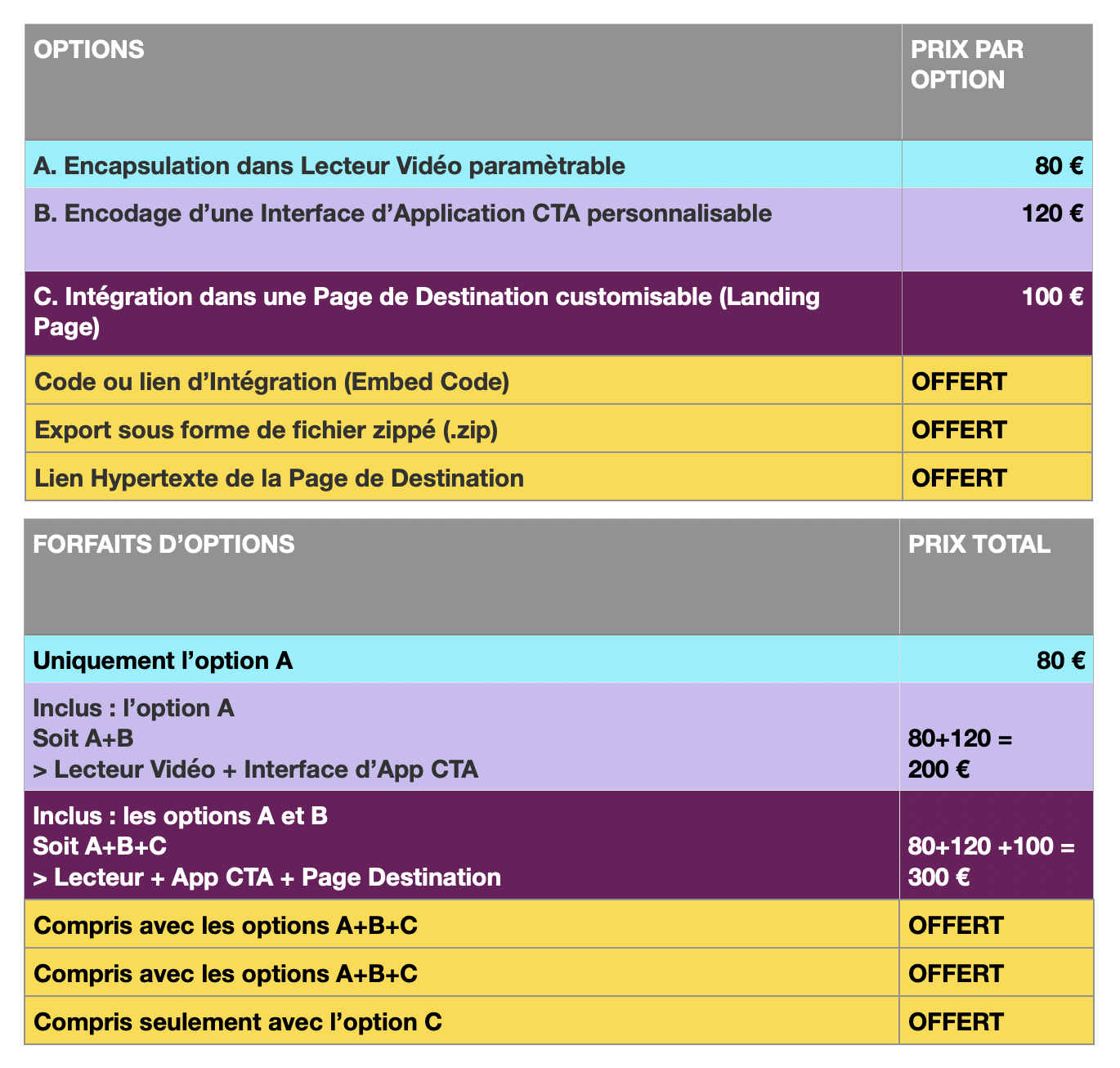 Attention : l'option B inclus l'option A et l'option C inclus les options A+ B