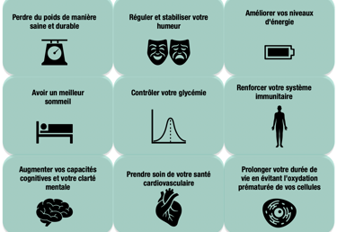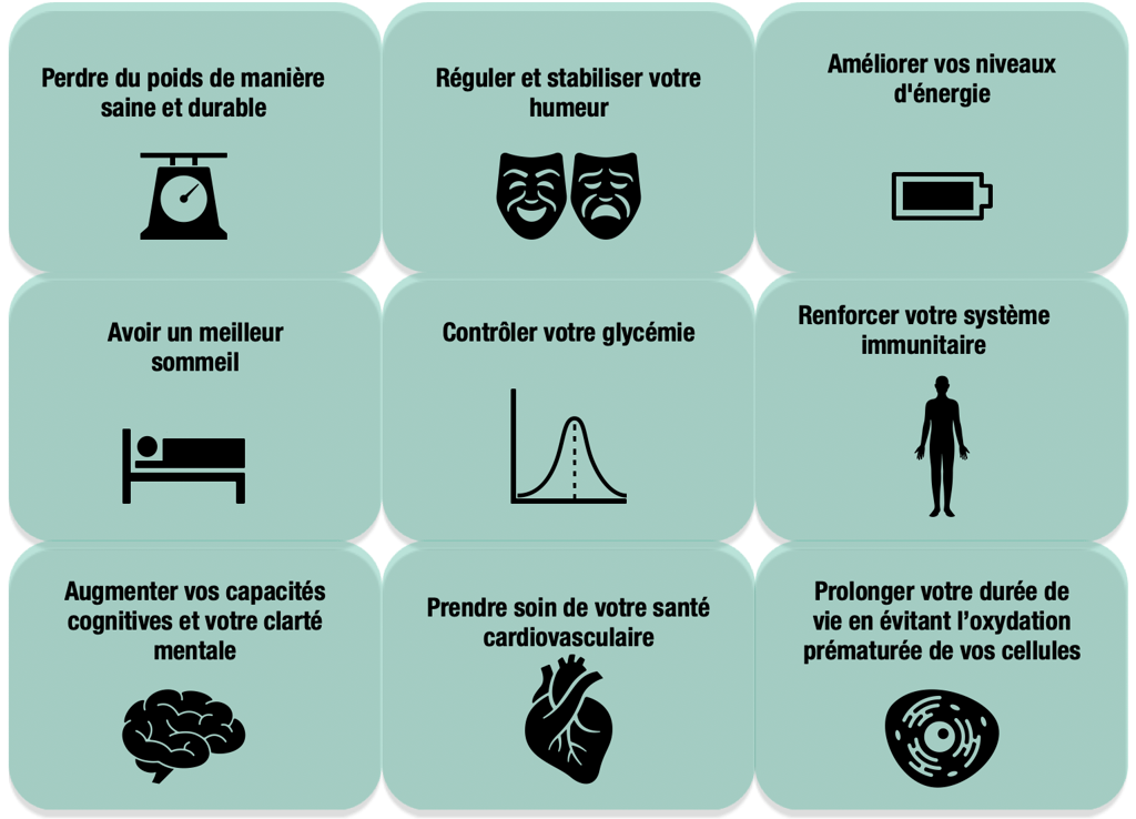 - Améliorer drastiquement votre santé surtout si avez des problèmes d'obésité, de diabète, d'inflammations chroniques, des douleurs articulaires, des maladies cardiaques , auto-immunes ou neurodégénératives, et enfin éviter efficacement les cancers de tous types !