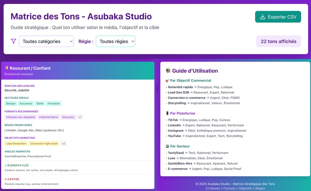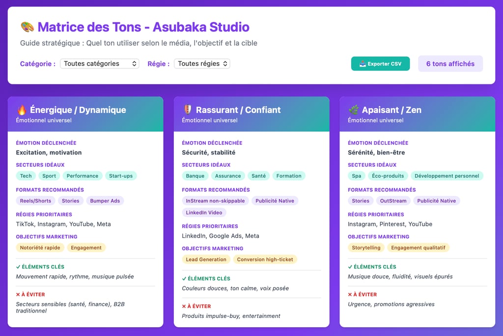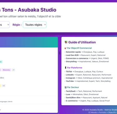 Le succès d'une campagne publicitaire ne repose plus uniquement sur le budget investi, mais sur l'adéquation chirurgicale entre le ton employé et la psychologie de l'audience ciblée. Pour répondre à ce défi de précision, d ‘Asubaka Studio met à disposition sa Matrice Stratégique des Tons, un outil en libre-service conçu pour rationaliser vos choix créatifs.