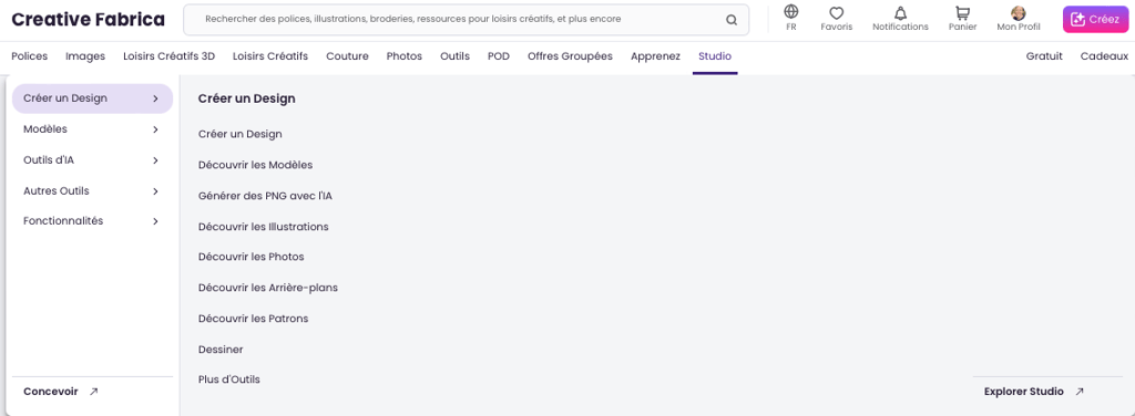 Voici quelques fonctionnalités principales de Creative Fabrica :