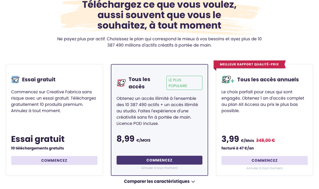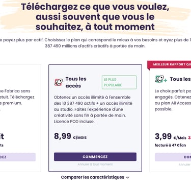Abonnements : Creative Fabrica fonctionne sur un modèle d'abonnement qui donne accès à un nombre illimité de téléchargements pour les abonnés. Cependant, il est aussi possible d'acheter des éléments individuellement.