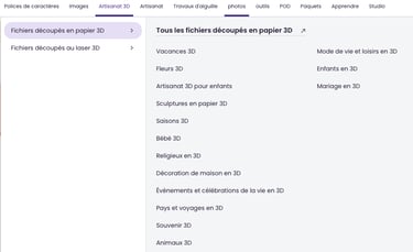 Cette sous-section propose une vaste collection de fichiers de conception pour projets artisanaux. Ces fichiers sont majoritairement au format SVG, PNG, DXF, et EPS, ce qui les rend compatibles avec des logiciels de découpe et des machines comme Cricut et Silhouette. Voici les types de ressources disponibles dans cette section :