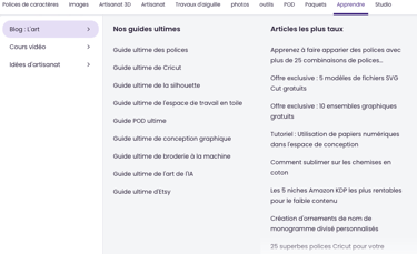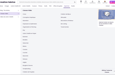 Retrouvez des milliers de cours en vidéo, des guides en pdf, des articles et des idées de loisirs créatifs dans ce menu, et tout ça encore et toujours gratuitement !