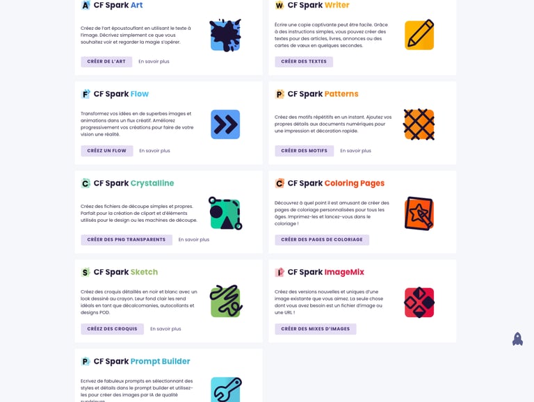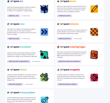 La famille CF Spark propose des outils basés sur l'intelligence artificielle qui permettent de générer des visuels, des motifs, des textes et bien plus encore de manière automatisée. Voici un récapitulatif des fonctionnalités de chaque outil :
