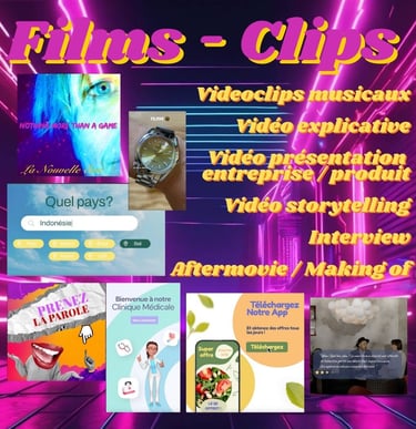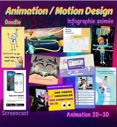 We create tailor-made videos for any type of content either from your rushes and graphic elements, or by creating a whole 3D animation (Pixar style) or in 2D motion design (classy, flow, photo cut out, Doodle sketch, bubble head...):