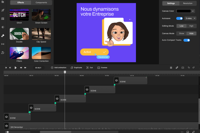 Addition of Sound Effects, music and voiceovers: 5 sound effects, 2 music and 1 voiceover included. (🔗 17 music genre : over 1000 tracks available)