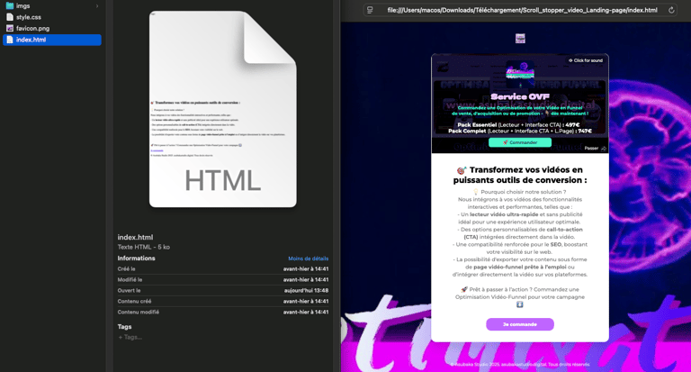 > Livraison de votre Landing Page (LP) avec votre vidéo intégrée sous forme d'une adresse internet (html) que vous pouvez copier et coller où vous le souhaitez ! Voir exemple ci-dessous.