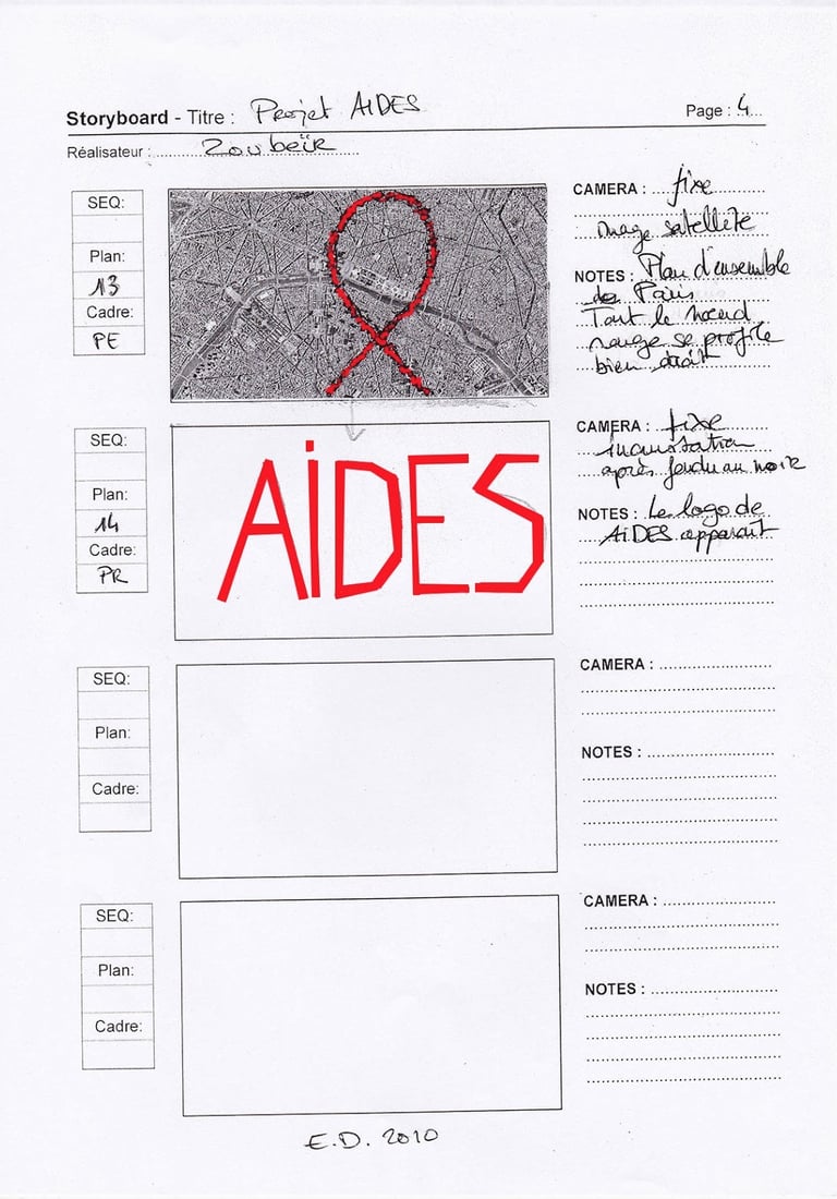 Voici quelques pages du storyboard dessine par Eva, notre directrice artistique) pour un clip de prévention contre le SIDA avec l'association AIDES en 2010.